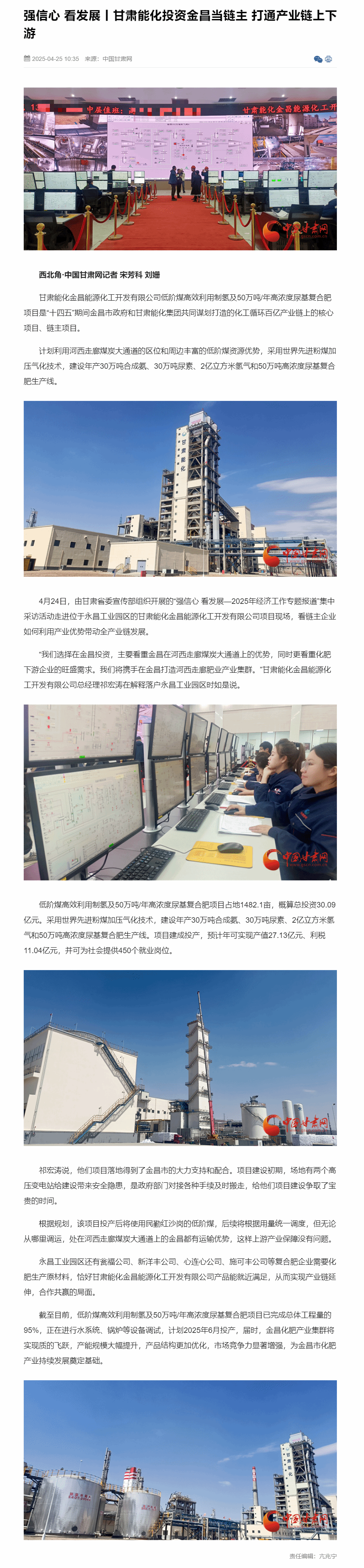 4月25日,中国甘肃网宣布了《强信心 看生长丨PG赏金女王投资金昌当链主 买通工业链上下游》文章。以图文形式对PG赏金女王集团金昌能源化工开发有限公司低阶煤高效使用制氢及50万吨/年高浓度尿基复合肥项目举行了报道。