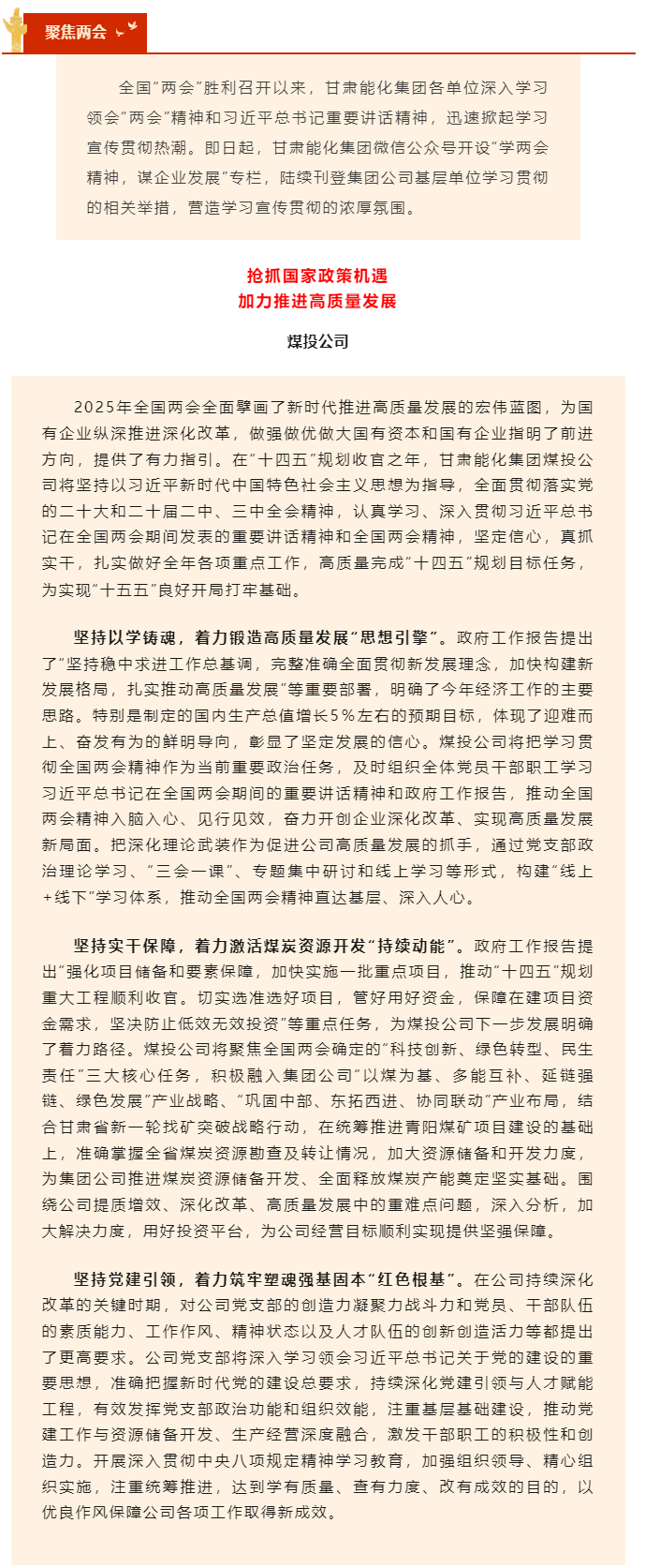 学两会精神 谋企业生长 | 煤投公司抢抓国家政策机缘 加力推进高质量生长
